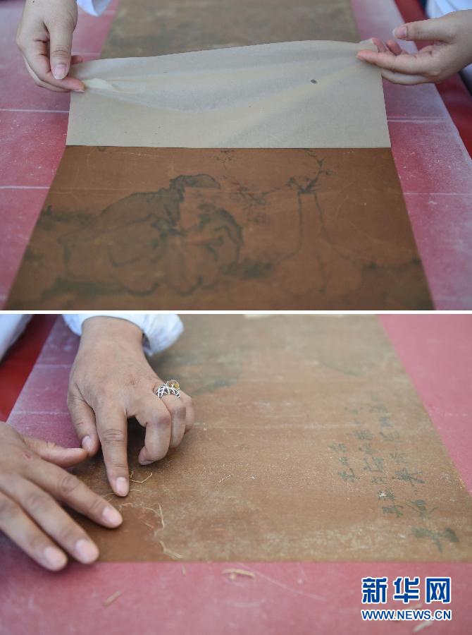 5月27日,首都博物馆的工作人员在展示利用生物揭展剂(上)和传统揭展剂(水)(下)对古书画作品进行揭展的效果(拼版照片)。新华社记者 罗晓光 摄
