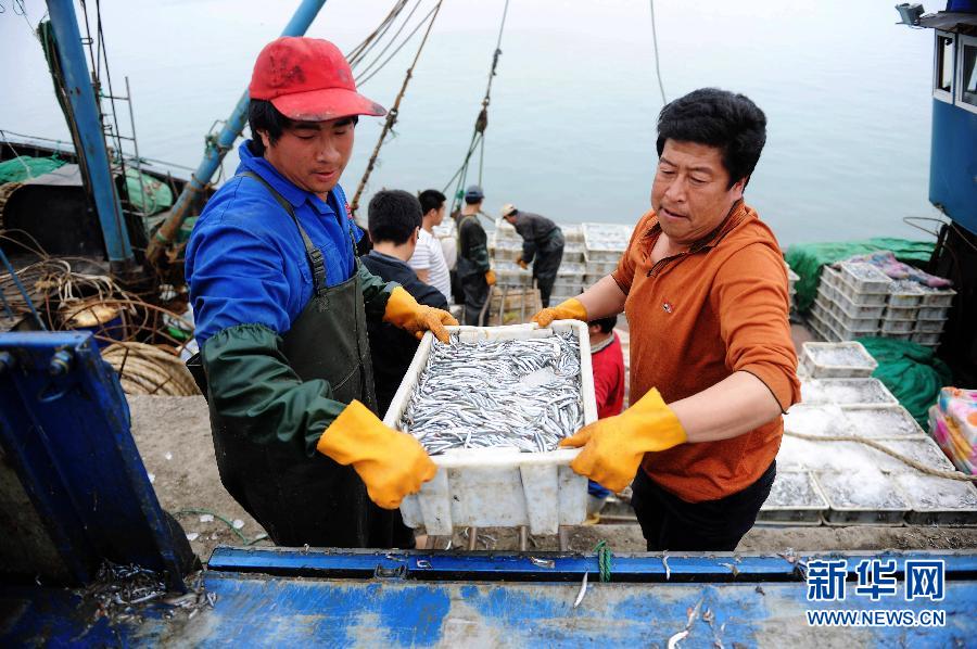 6月1日,在山东青岛积米崖渔港码头,渔民们将休渔前鱼货装载上车。