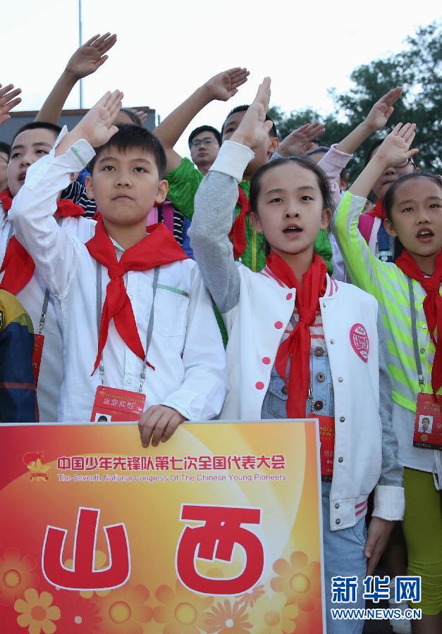 6月2日,少先队员在天安门观礼台向国旗敬礼并唱国歌。当日,中国少年先锋队第七次全国代表大会全体代表在北京天安门观看升国旗仪式。6月1日到2日,中国少年先锋队第七次全国代表大会在北京举行。新华社记者王申摄
