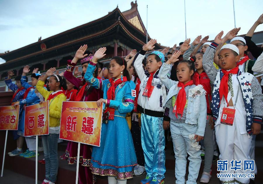 6月2日,少先队员在天安门观礼台向国旗敬礼并唱国歌。当日,中国少年先锋队第七次全国代表大会全体代表在北京天安门观看升国旗仪式。6月1日到2日,中国少年先锋队第七次全国代表大会在北京举行。新华社记者王申摄