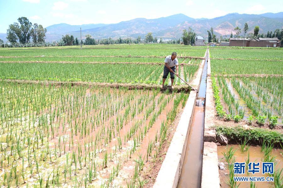 云南省巍山彝族回族自治县庙街镇古城村委会宗旗厂村农民刘玉笏在田间抽水灌溉稻田(6月3日摄)。 2015年4月以来,云南省巍山彝族回族自治县出现持续高温少雨天气,迄今未形成有效降雨,土地旱情较重,农作物生产用水难以保障。目前,该县全力投入抗旱救灾,积极调配水资源,寻找新水源,并实施改种补植、抽水保苗等应急补救措施,优先保障人畜饮水,努力开展生产自救。新华社发(张树禄 摄)