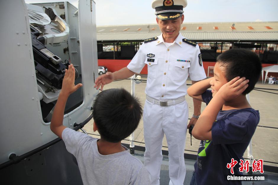 图为华裔少年参观“竺可桢”船上武器。 中新社发 杨新明 摄