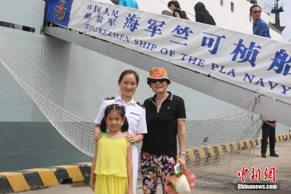 图为华人华侨与随舰女军官合影留念。 中新社发 羊牧 摄