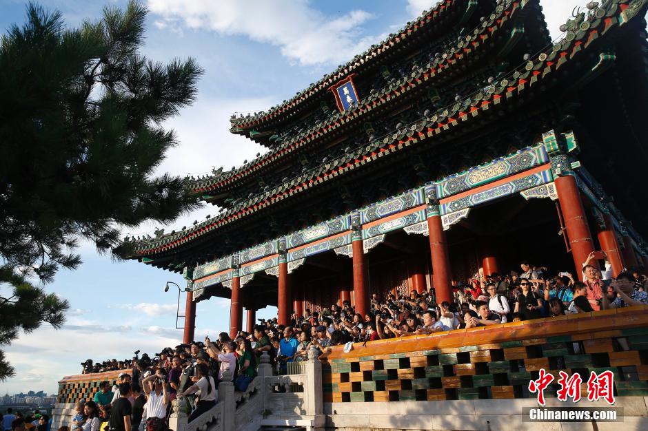 6月12日,北京天气晴好,摄影爱好者和游客挤满景山万春亭观看落日晚霞。中新社发 盛佳鹏 摄