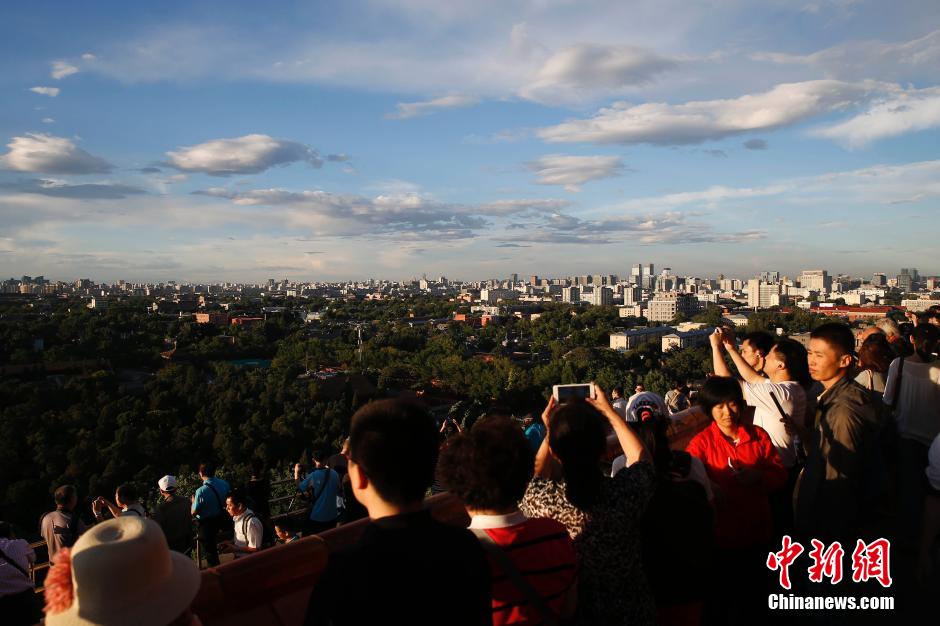 6月12日,北京天气晴好,摄影爱好者和游客挤满景山万春亭观看落日晚霞。中新社发 盛佳鹏 摄