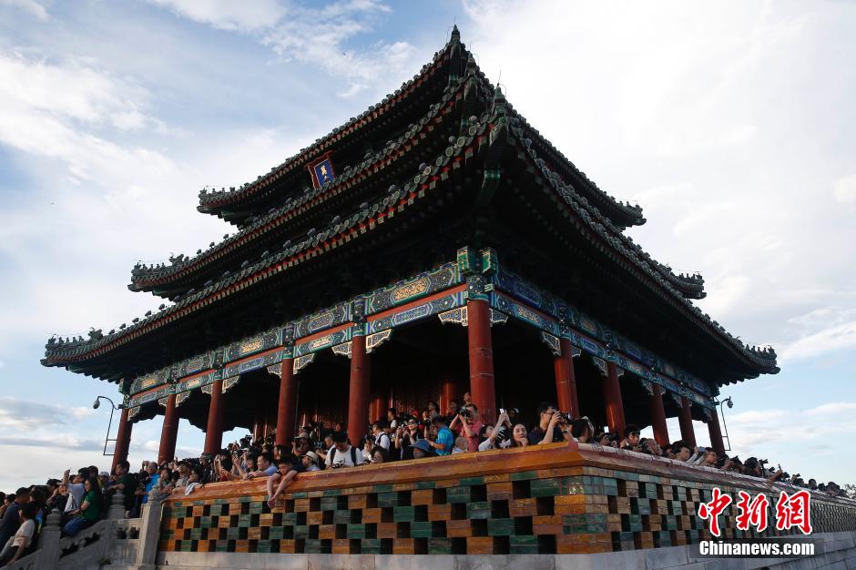 6月12日,北京天气晴好,摄影爱好者和游客挤满景山万春亭观看落日晚霞。中新社发 盛佳鹏 摄