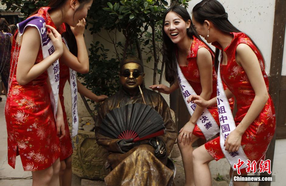 6月12日,2015国际旅游小姐中国总决赛在重庆安居古城拉开帷幕,来自浙江、江苏、山东、新疆、河南、四川、安徽、贵州、福建、哈尔滨、北京、上海以及重庆的51位佳丽参赛。图为参赛佳丽在重庆安居古城展示风采。中新社发 钱兴强 摄