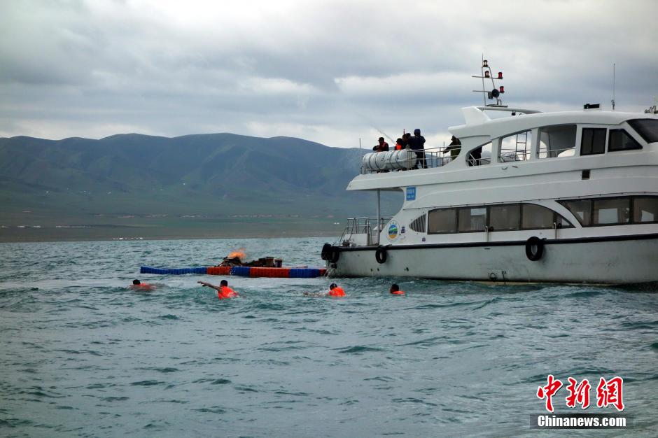 图为“失火”游船部分“游客”在转移过程中落水。赵凛松 摄
