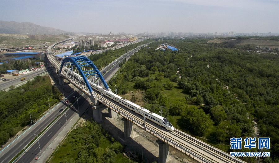 一辆动车从乌鲁木齐市区内穿行而过(5月27日摄)。
