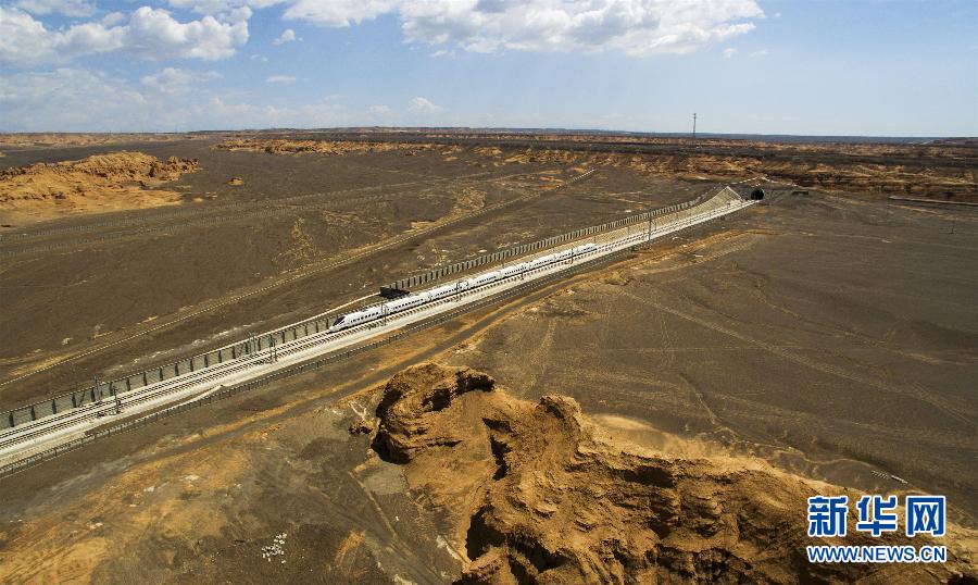 一辆动车从新疆吐鲁番地区鄯善县七克台镇附近的雅丹地貌旁穿行而过(6月9日摄)。 新华社航拍小组摄
