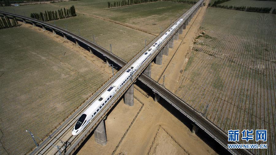 一辆动车行驶在哈密至罗布泊铁路上(5月21日摄)。 新华社航拍小组摄