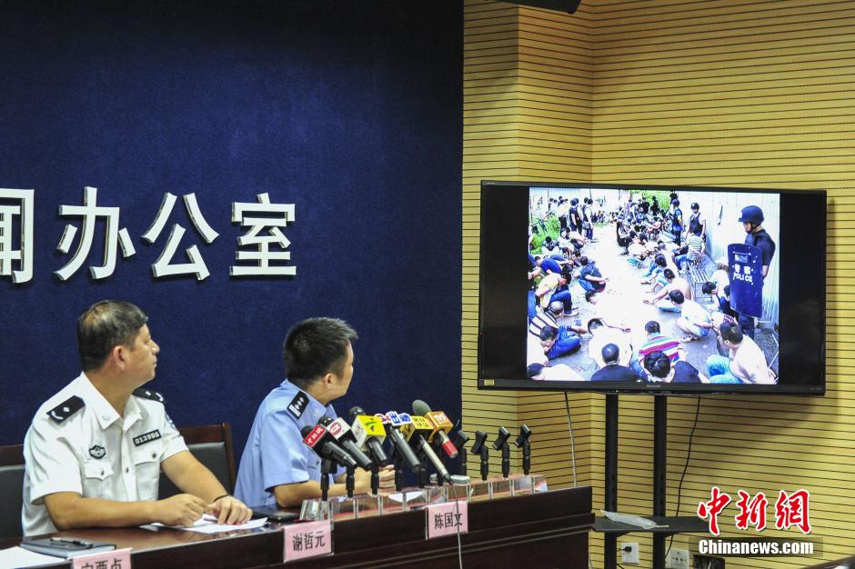 6月25日,广州市公安局通报称,本月24日凌晨,广州800多名刑警、特警成功摧毁一个活跃在番禺区南村镇一带的黑恶犯罪集团,现场抓获包括涉黑头目在内的嫌疑人67名。该团伙曾在2014年10月18日在番禺区南村,因争抢工地工程组织数十人鸣枪威胁并持刀砍伤3名工地员工。图为办案民警介绍行动细节。中新社发 陈骥旻 摄