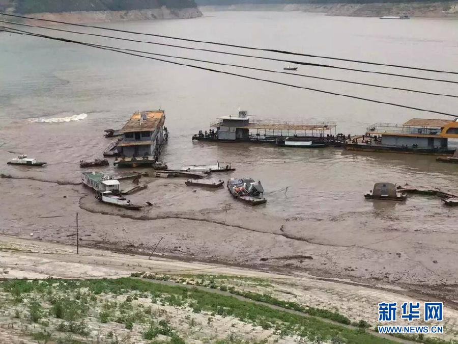 当日18时40分许,重庆巫山大宁河江东寺北岸突发大面积滑坡引发巨大涌浪,造成对岸(南岸)靠泊的多艘小型船舶(渔船、农用船为主)翻沉,另有多艘靠泊船舶断缆漂航。目前,人员伤亡情况不详。据了解,海事部门已对事发水域实施临时交通管制,长江干线水上搜救协调中心已协调6艘海巡艇并调集多艘打捞船舶赶往现场施救。新华社发(朱云平 摄)
