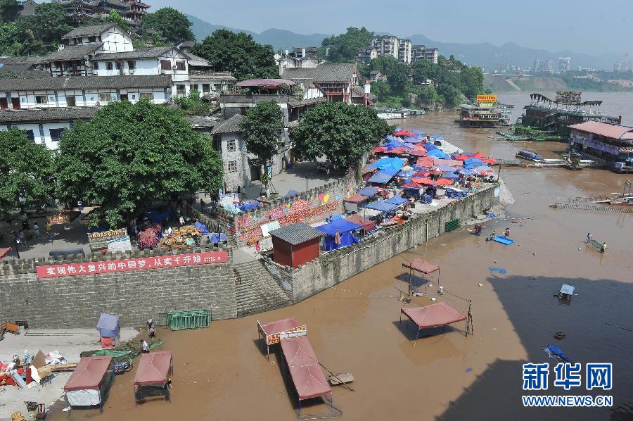 6月26日,洪峰过境致使嘉陵江磁器口段水位上涨,部分临江商铺被淹。当日,重庆市防汛办发布消息称,受四川中部、东北部及重庆境内降雨影响,长江、嘉陵江重庆段迎来过境洪峰。26日出现最高水位,水位相较前日上涨5米。重庆著名旅游景点磁器口古镇也受到洪峰过境的影响,临江商家陆续紧急撤离。新华社记者 唐奕 摄