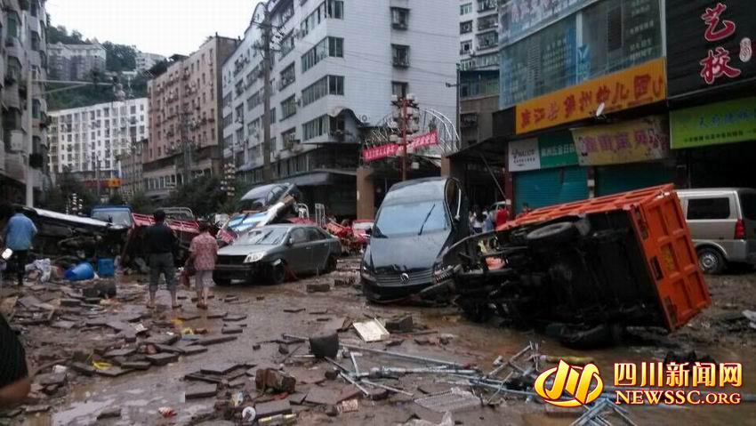 6月28日,南江县普降暴雨,引发山洪,导致南江河沿河城镇全部受灾。其中,南江县城区城河街受灾较为严重。28日傍晚,洪水退去后,街上泥泞不堪,一片狼藉。一度被洪水淹没的汽车也露出各种姿态,一辆汽车竟然骑在了一辆三轮车上。记者 陈连波 图片来源:四川新闻网