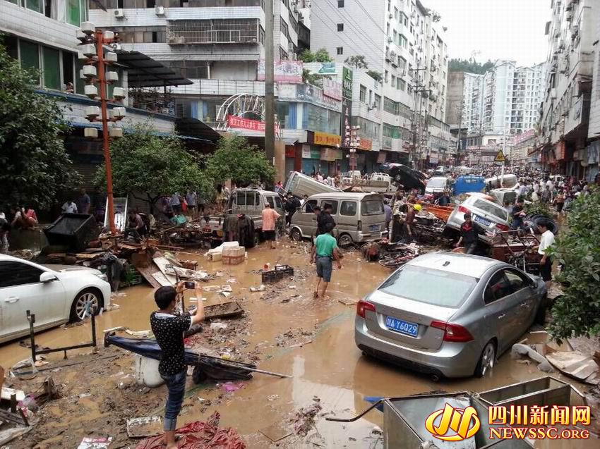 6月28日,南江县普降暴雨,引发山洪,导致南江河沿河城镇全部受灾。其中,南江县城区城河街受灾较为严重。28日傍晚,洪水退去后,街上泥泞不堪,一片狼藉。一度被洪水淹没的汽车也露出各种姿态,一辆汽车竟然骑在了一辆三轮车上。记者 陈连波 图片来源:四川新闻网