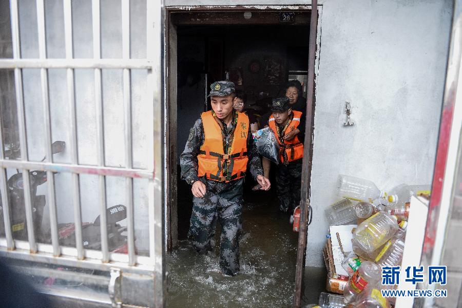 6月28日,在江苏常州戚墅堰区芳渚村,南京军区官兵营救出一名71岁老人。据江苏常州市防汛防旱指挥部消息,26日至27日的连续强降水致大运河常州城区段水位超运北片城市防洪大包围设计高水位,目前已致约6.5万人受灾,直接损失超过4.1亿元。新华社记者李响摄