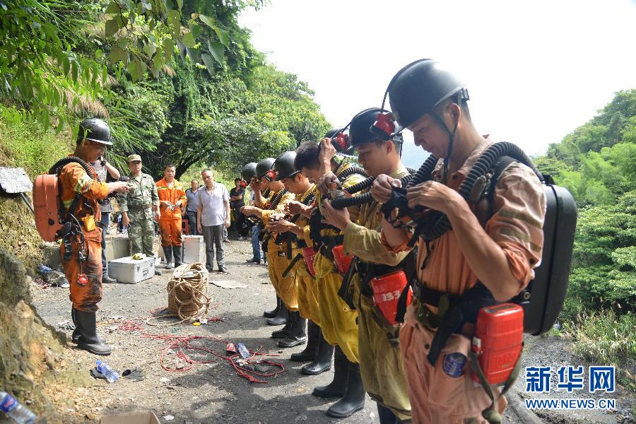6月28日,救援人员下井实施救援前检查装备器材。 6月27日晚,福建省龙岩市永定区培丰镇文东村发生一起已关闭无证煤矿非法入井人员被困事件。救援指挥部组织8支救护队全力搜救,至28日18时30分被困9人全部找到,但已遇难。现场指挥部已着手善后处置工作。据查,非法入井人员有12人,其中出井3人。新华社发(苏高龙 摄)