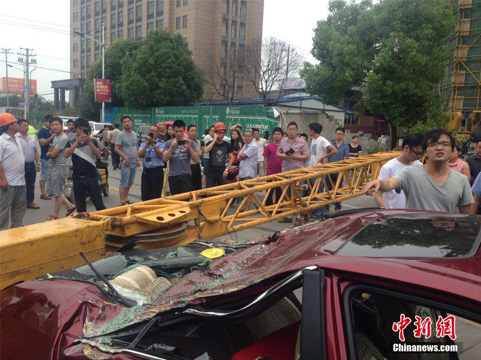 6月28日9时许,位于浙江省宁波市鄞州区高桥镇的大红鹰学院门口一吊机吊臂倒下,砸中一辆汽车,车内2人有惊无险逃过一劫。目前,事故原因相关部门正在调查之中。 中新社发 何蒋勇 摄