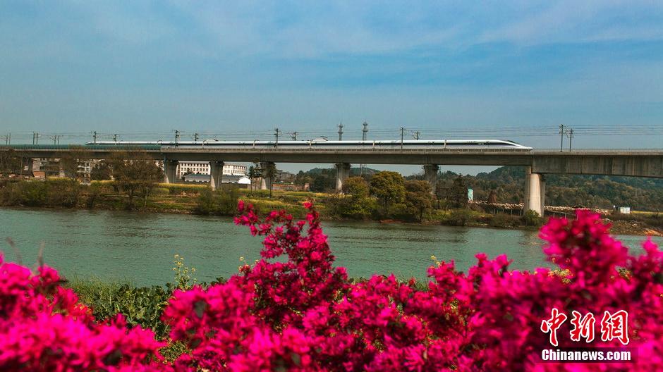 图为动车掠过花海。张卫东 摄
