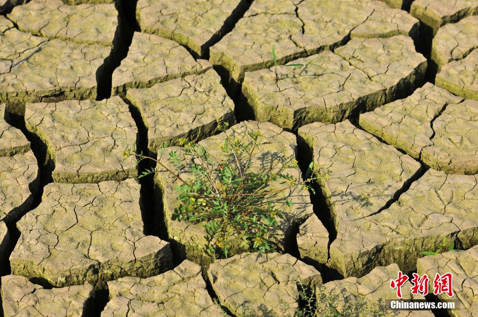 6月28日,由于连日来的干旱,日照水库水位告急,水库水域面积急剧减少,以荻竹涧村以北为界,水库西部只有几个水坑残存着少量的水,以东至水库泄洪闸门处尚存部分水。裸露出来的水库库底已经开始龟裂并长满野草,放眼望去绿油油一片宛如草原,随处可见一些死亡的鱼、河蚌等。中新社发 张磊 摄