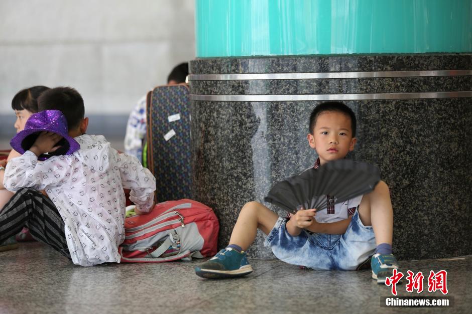 2015年铁路暑运大幕将于7月1日正式拉开,江西南昌连续多日持续高温“桑拿”天气,不少出行旅客在出行候车期间想尽方法纳凉避暑。6月30日,南昌火车站广场前及售票大厅里,不少出行旅客在有冷气的售票大厅或地下出站口周围“躲避”高温,还有的旅客耐不住困意就地寻找阴凉处午休。姜涛 摄