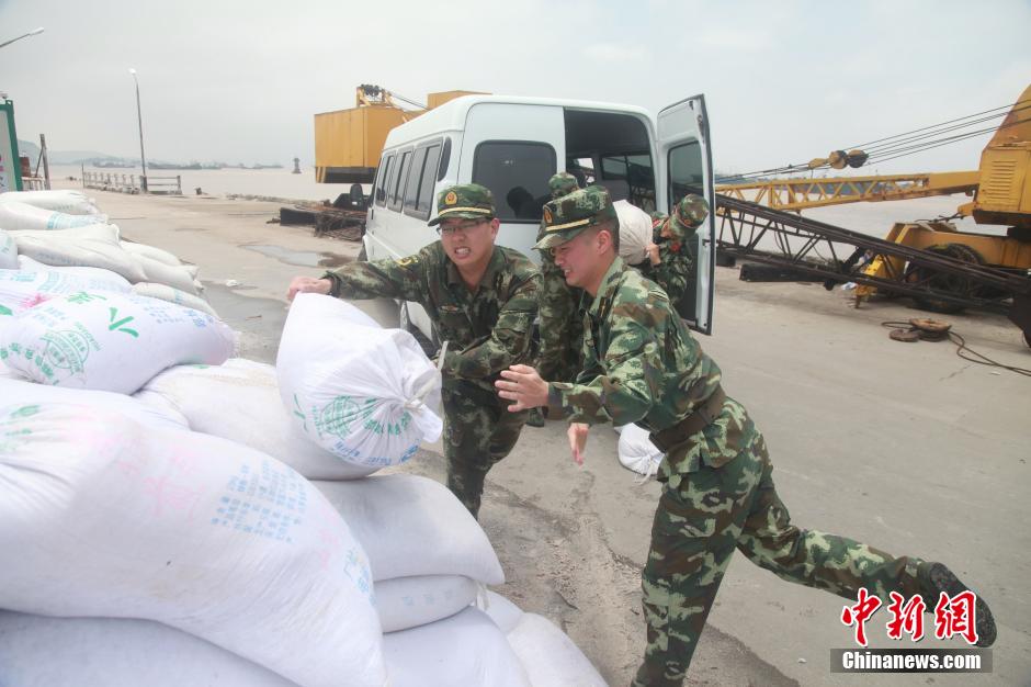 图为边检官兵搬运防台风物资。 中新社发 刘恒 摄