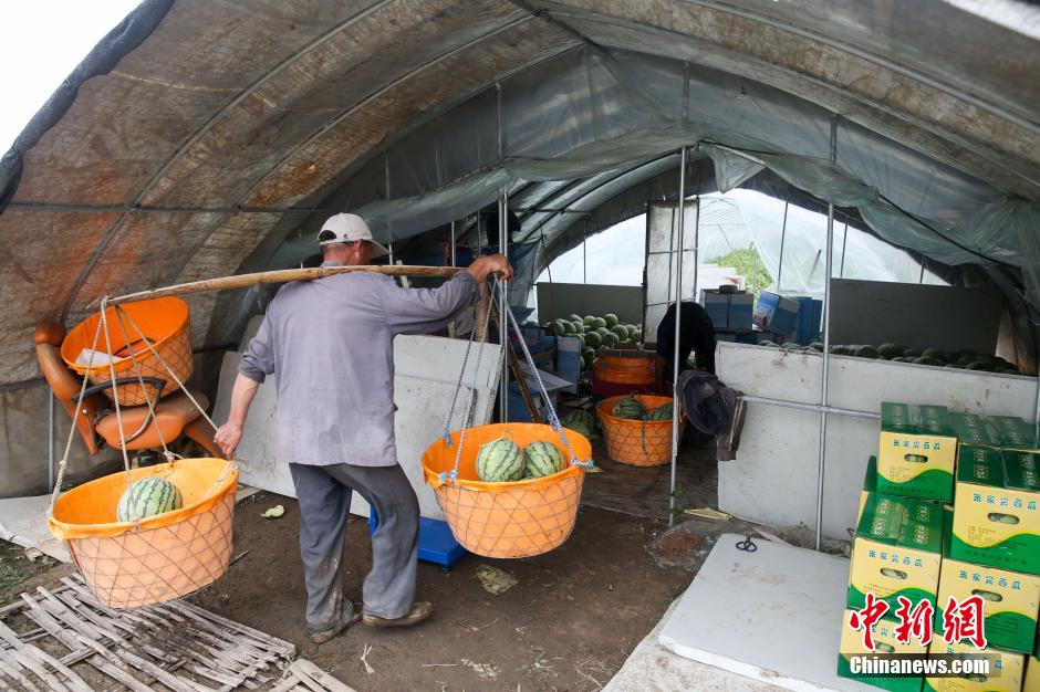 7月9日下午,舟山朱家尖棉增经济合作社的瓜农正在地里抢收西瓜,以减少即将登陆的台风“灿鸿”带来的损失。目前,舟山市已经启动防汛防台Ⅲ级应急响应,积极做好防台各项工作,密切关注台风动向。 中新社发 余若望 摄