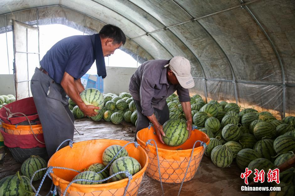 7月9日下午,舟山朱家尖棉增经济合作社的瓜农正在地里抢收西瓜,以减少即将登陆的台风“灿鸿”带来的损失。目前,舟山市已经启动防汛防台Ⅲ级应急响应,积极做好防台各项工作,密切关注台风动向。 中新社发 余若望 摄