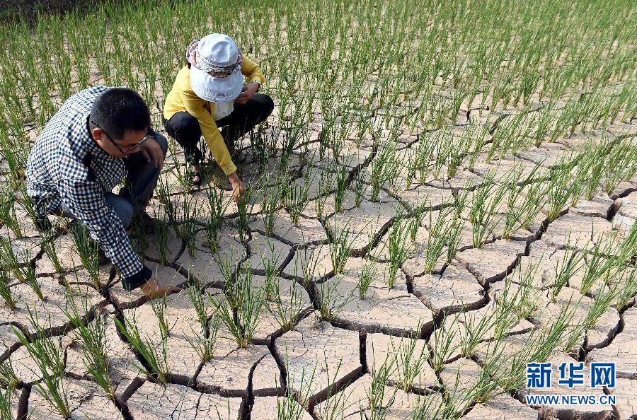 7月8日,牟定县新桥镇两名指导抗旱救灾的工作人员在桃苴村委会老梅树村查看受灾严重的水稻。 新华社记者 杨宗友 摄 图片来源:新华网