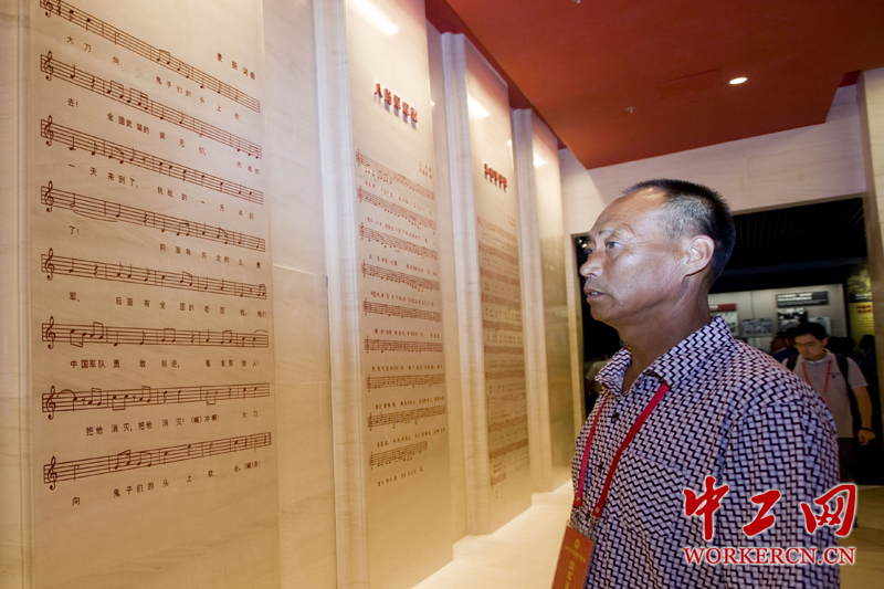 徐恩宝是丹东市环境卫生管理处挑粪班长,典型的东北大汉。他正在抗日战争纪念馆内认真地看着墙上的《大刀进行曲》歌词。中工网记者 李雪峰 摄