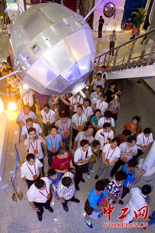 我国第一颗人造地球卫星“东方红一号”模型再次响起音乐《东方红》,吸引了劳模们驻足观看。 中工网记者 李雪峰 摄