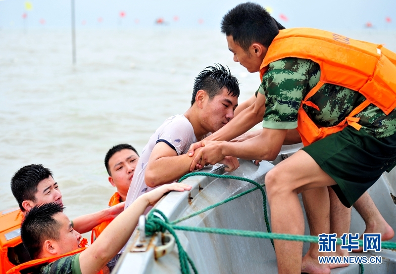 随着暑期来临,海边溺水事故呈现高发态势。为提高海上救援能力,江苏公安边防总队连云港支队组织各边防派出所官兵开展海上救援演练。图为九里边防派出所官兵救助“溺水”游客(7月18日摄)。 新华网发 丁小添 摄