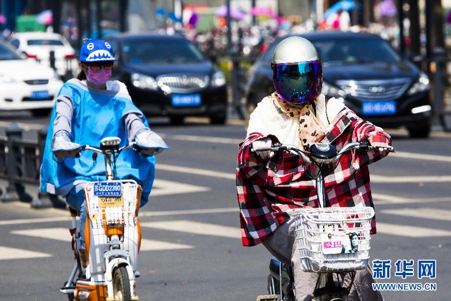 8月3日,在江苏省连云港市赣榆区街头,人们做好防晒措施在高温中出行。当日,我国多地持续“烧烤模式”,气温超过35摄氏度。中央气象台3日18时继续发布高温黄色预警,预计8月4日白天,新疆南疆盆地、吐鲁番盆地及准噶尔盆地、四川盆地中东部、重庆、黄淮南部、江淮、江汉、江南大部、华南东部等地有35摄氏度以上高温天气,部分地区最高气温接近或超过40摄氏度。新华社发(司伟 摄)