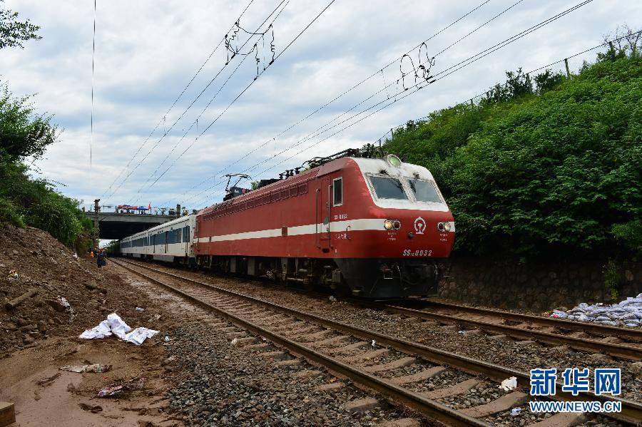 8月4日,一列旅客列车安全通过陇海线窑村至临潼站间水害修复路段。当日11时51分左右,西安铁路局管内陇海铁路窑村至临潼站因暴雨受损的铁路线路修复,陇海铁路上下行线恢复通车。 8月3日傍晚,西安地区遭暴雨突袭,18时至21时30分连续降雨量超过90毫米,致使陇海线窑村至临潼站间路堑边坡溜坍,水漫线路,列车被迫中断运行。西安铁路局立即启动防洪应急预案,先后调集2200余名抢险队员,集结挖掘机、装载机及平板车台组织现场抢险。新华社发 唐振江 摄 图片来源:新华网