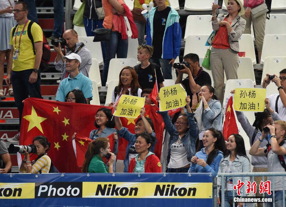 当地时间8月9日晚间,第16届国际泳联世锦赛游泳赛事收官,图为中国观众在现场为孙杨加油。当天,男子1500米自由泳决赛中,孙杨因身体原因退赛。