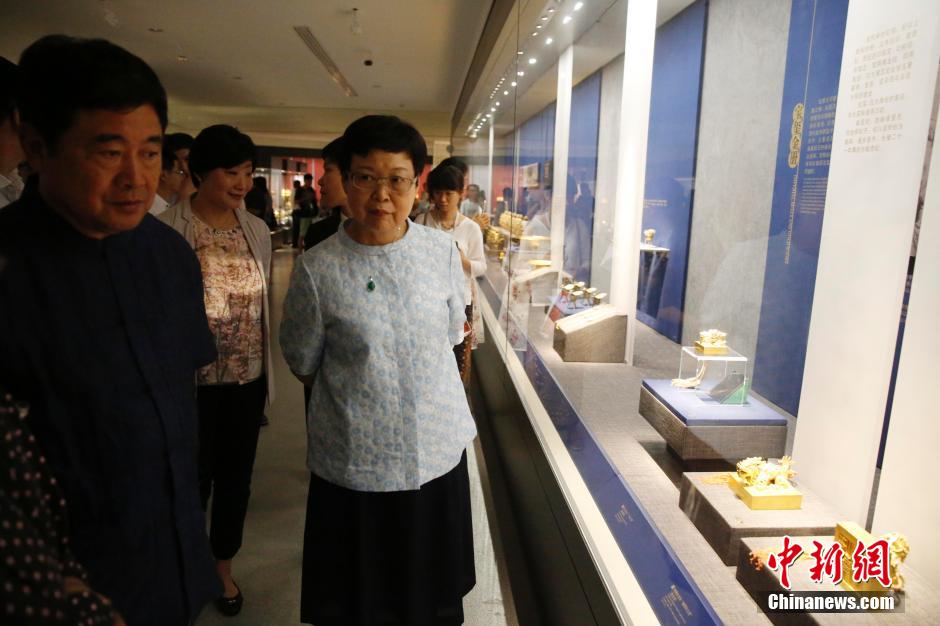8月11日,故宫博物院院长单霁翔(左)与台北故宫博物院院长冯明珠参观故宫博物院精品文物馆。中新社发 韩海丹 摄