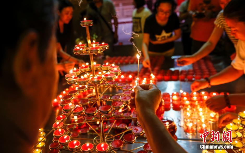 8月14日,天津民众前往潮音寺,为天津港“8·12”特别重大火灾爆炸事故的遇难者祈福。   中新社发 张浩 摄
