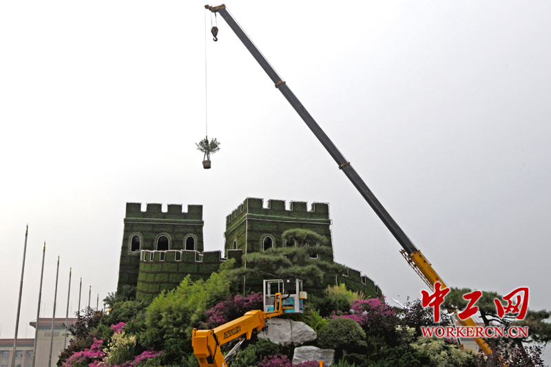 据介绍,此次搭建的“长城”主题山水花坛总占地3000平方米,分为东西两组,单组东西长60米,南北宽25米。和近年来“大花篮”、“宫灯”等造型的广场中心花坛不同,此次山水花坛的体积更大,用花量更大,并使用了龙柏、叶子花、油松等大型植物3000株,此外还有小型花卉70000盆、景观石及仿真景观石1200平方米。中工网记者 张起晨 摄