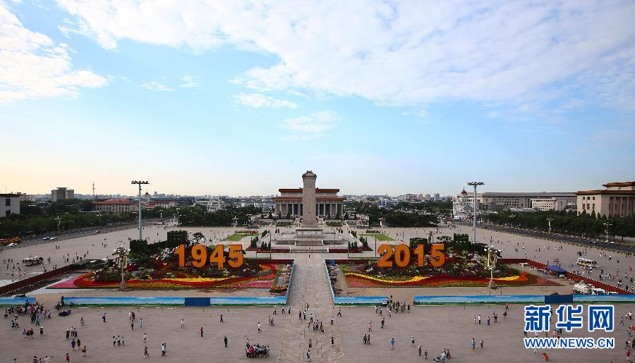 8月26日拍摄的天安门广场长城主题花坛。 8月26日零时,北京市花木有限公司承建的天安门广场纪念抗战胜利70周年花卉全部布置完毕。此次天安门广场花卉布置主要包括四个方面:人民英雄纪念碑周边的桧柏花带、人民英雄纪念碑北侧的长城主题花坛、广场内东西两块绿地的花柱、花球、花带以及广场东西侧路的花钵80组。其中长城主题花坛总占地3000平方米,两组花坛每组东西长60米,南北宽25米,使用龙柏、叶子花、油松等大型植物3000株,小型花卉7万盆、景观石及仿真景观石1200平方米。新华社记者 殷刚 摄