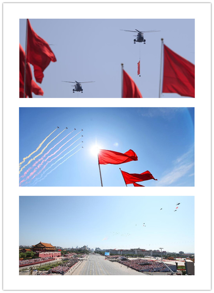 9月3日,中国人民抗日战争暨世界反法西斯战争胜利70周年纪念大会在北京隆重举行。这是空中护旗方队通过天安门广场。