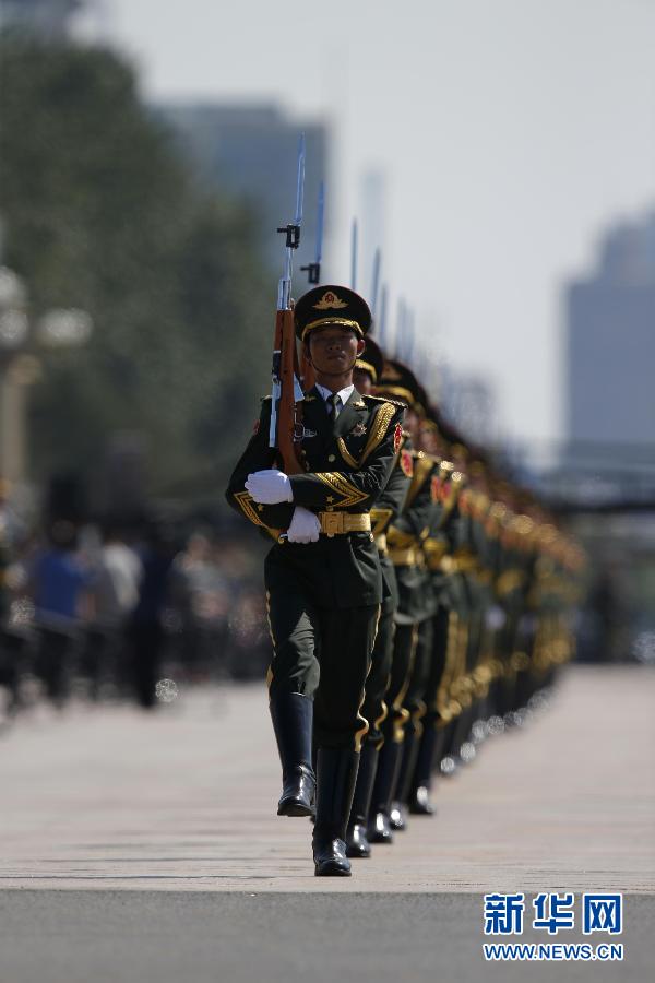 9月3日,中国人民抗日战争暨世界反法西斯战争胜利70周年纪念大会在北京隆重举行。这是标兵就位。 新华社记者费茂华摄