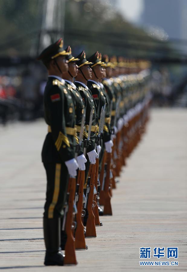 9月3日,中国人民抗日战争暨世界反法西斯战争胜利70周年纪念大会在北京隆重举行。这是标兵就位。 新华社记者费茂华摄