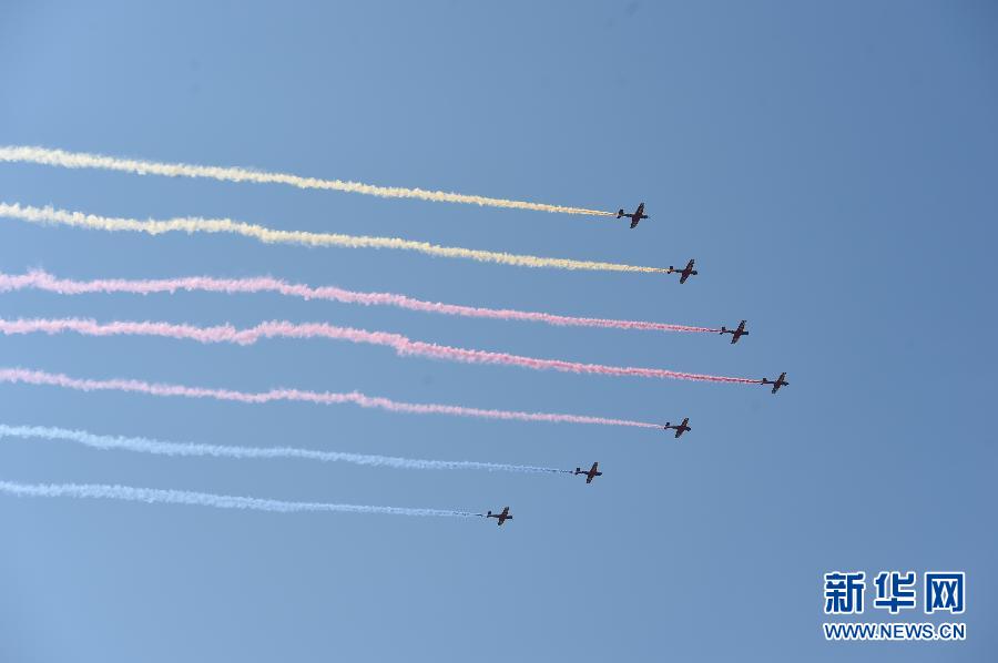 9月3日,中国人民抗日战争暨世界反法西斯战争胜利70周年纪念大会在北京隆重举行。这是空中护旗方队的7架教练机拉出七道彩带飞过天安门广场。新华社记者 赵颖全 摄