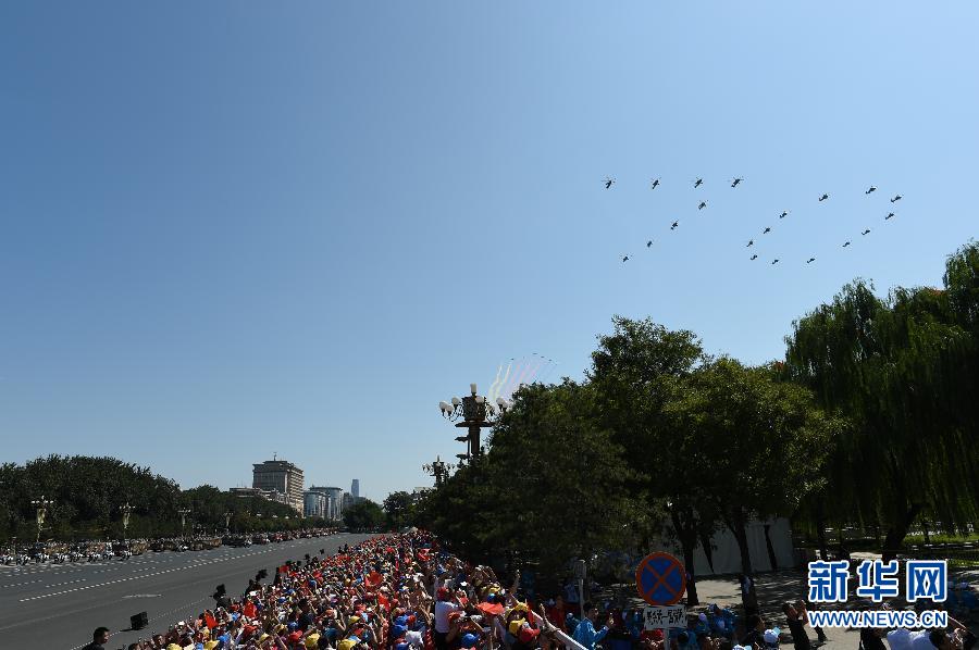 9月3日,中国人民抗日战争暨世界反法西斯战争胜利70周年纪念大会在北京隆重举行。这是20架直升机在空中组成“70”字样。 新华社记者王建威 摄