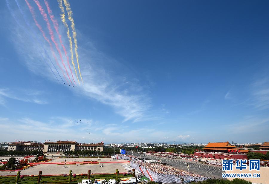 9月3日,中国人民抗日战争暨世界反法西斯战争胜利70周年纪念大会在北京隆重举行。这是空中护旗方队的7架教练机拉出七道彩带通过天安门广场。新华社记者 杨磊 摄