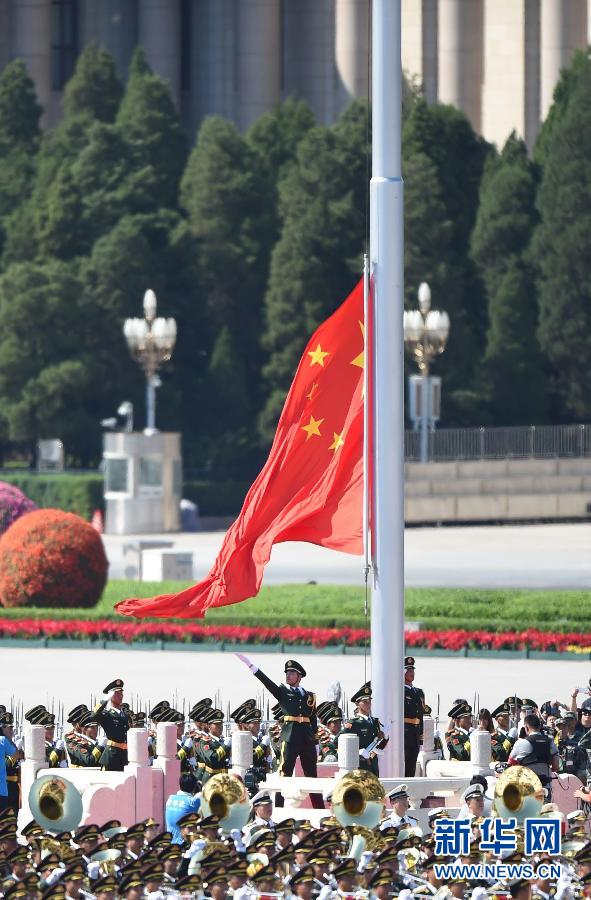 9月3日,中国人民抗日战争暨世界反法西斯战争胜利70周年纪念大会在北京隆重举行。这是天安门广场举行隆重的升国旗仪式。新华社记者潘昱龙摄