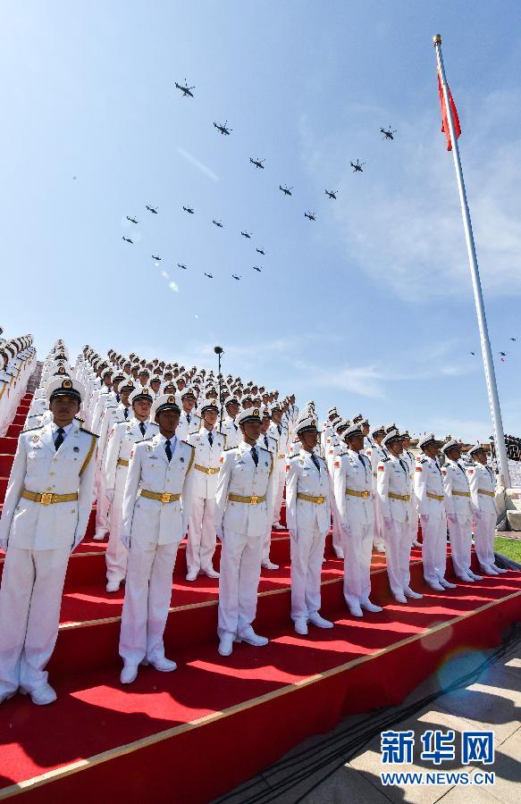 9月3日,中国人民抗日战争暨世界反法西斯战争胜利70周年纪念大会在北京隆重举行。这是20架直升机在空中组成“70”字样通过天安门广场。新华社记者徐速绘摄