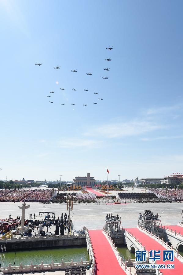 9月3日,中国人民抗日战争暨世界反法西斯战争胜利70周年纪念大会在北京隆重举行。这是20架直升机在空中组成“70”字样通过天安门广场。新华社记者 赵鹏 摄