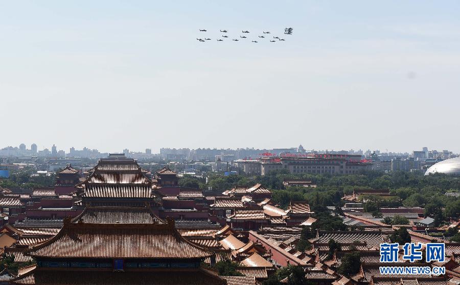 9月3日,中国人民抗日战争暨世界反法西斯战争胜利70周年纪念大会在北京隆重举行。这是20架直升机在空中组成“70”字样飞过天安门广场。新华社记者岳月伟摄
